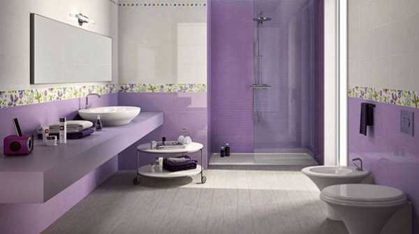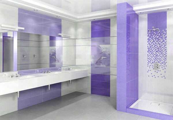 Очень нежно и спокойно смотрятся в интерьере светлые оттенки фиолетового, прекрасно подходят для небольших комнат. Такая обстановка не будет слишком утомительной или эмоциональной. Чем больше площадь ванной, тем более глубокие и яркие оттенки можно использовать. Если говорить о комбинациях, то гармонично сочетаются между собой все оттенки фиолетового, дополнить их можно зеленым, желтым или белым.