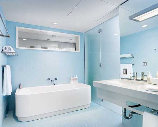 Ванная в синих оттенках лучше всего подходит людям спокойного уравновешенного склада. Синий цвет позволяет меланхоликам расслабиться после дневной суеты, а на флегматиков действует стабилизирующе.