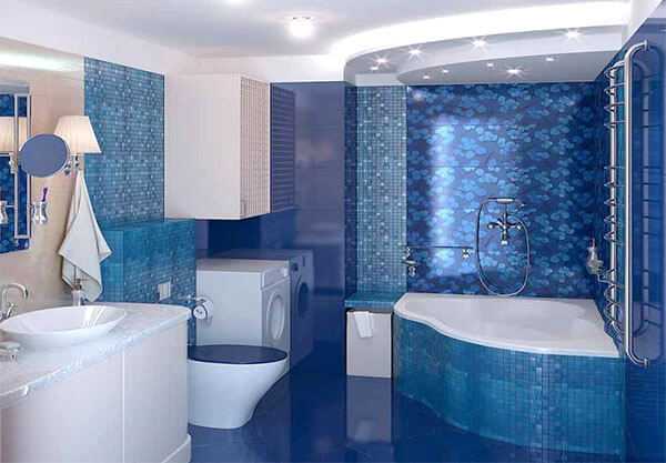 Многим синий кажется холодным и неуютным, но на самом деле он отлично подходит для интерьера ванной. Главное, правильно подобрать сопутствующие теплые тона. Комбинировать его можно с белым, оранжевым, бежевым. В синий интерьер отлично вписывается дерево и другие природные материалы.