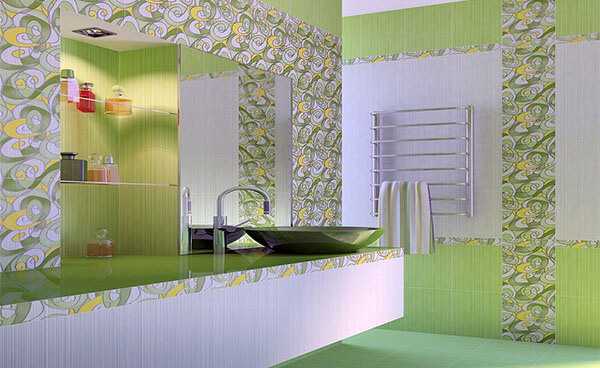 Чаще всего встречается оформление стен плиткой белого, серого, бирюзового, зеленого, красного, синего, цветов. Несколько реже можно встретить салатовую, фиолетовую, желтую и красную отделку.