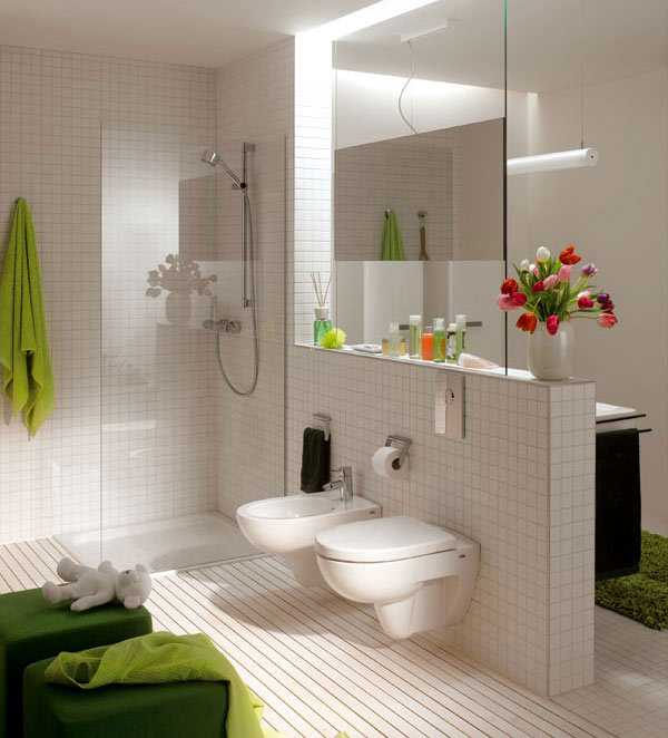 Чтобы зрительно увеличить объем маленькой комнаты, рекомендуется выбирать плитку светлых оттенков — голубую, лазурную, светло-зеленую, а также использовать зеркальные вставки, зеркальные шкафчики и навесные зеркала. В сочетании с правильно подобранной подсветкой такое оформление будет смотреться очень красиво.