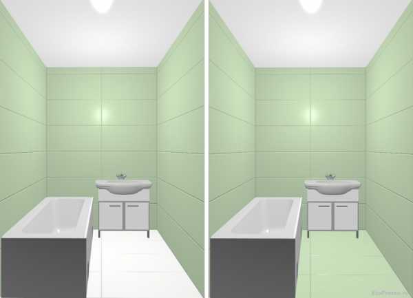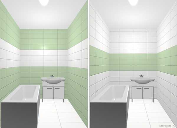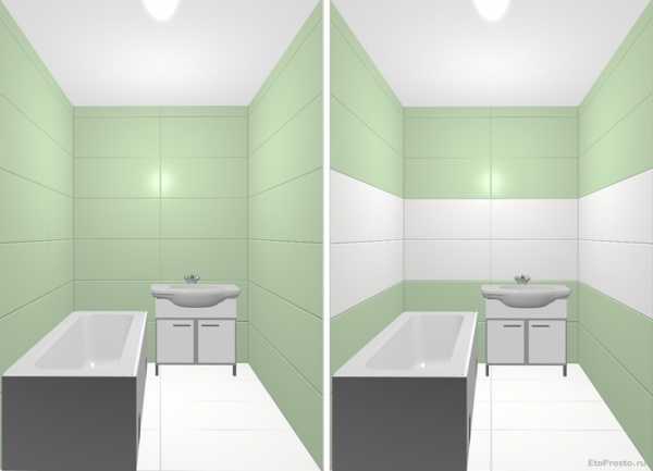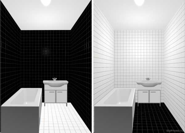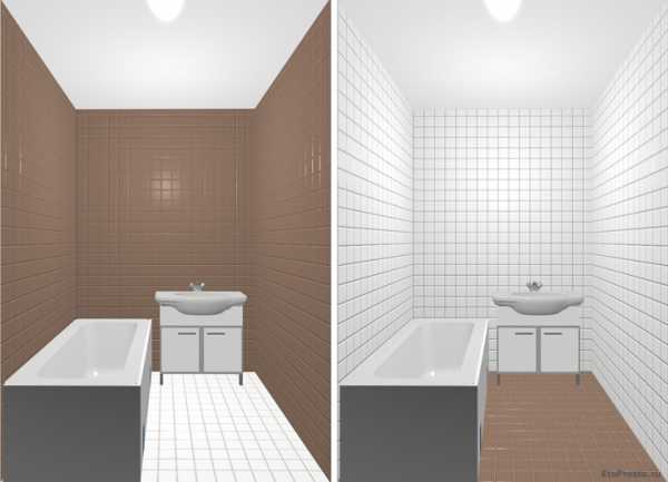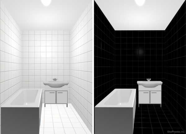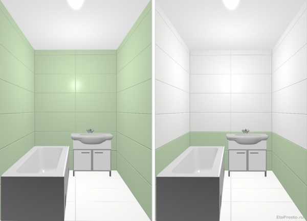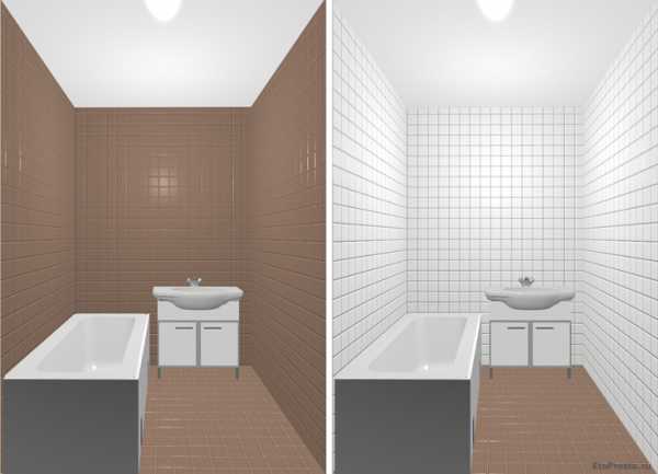 К примеру, светлый верх и темный низ визуально уменьшит размеры ванной. Такой же эффект достигается большими плитами на полу.