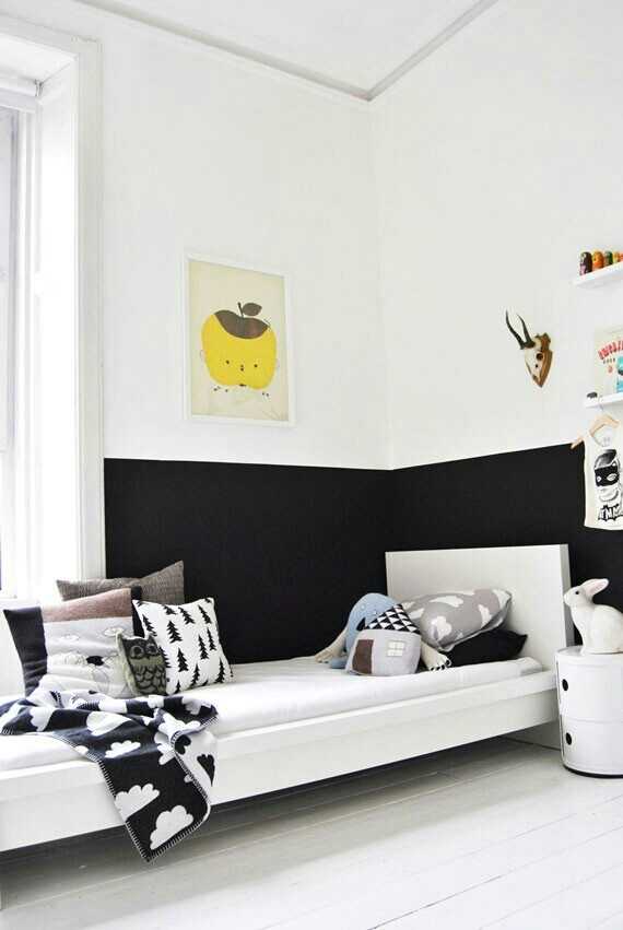 Такое оформление позволяет быстро и эффективно освежить любой интерьер. После окраски стены одним цветом необходимо отметить полосу необходимой ширины. Подобная комбинация идеальна для коридора и детских комнат.