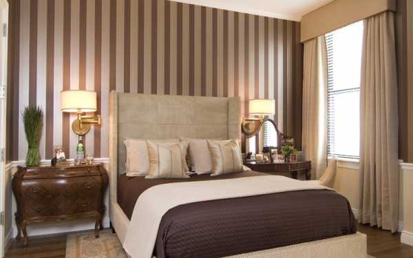 Полосы нежного бежевого цвета в спальне на стенах, фото