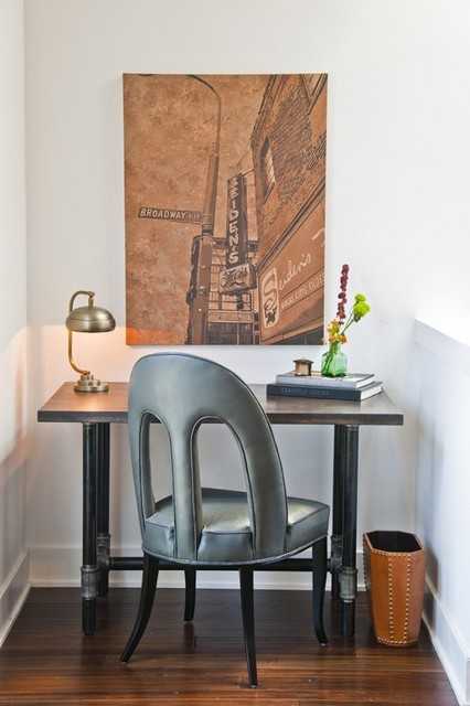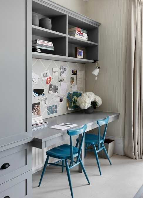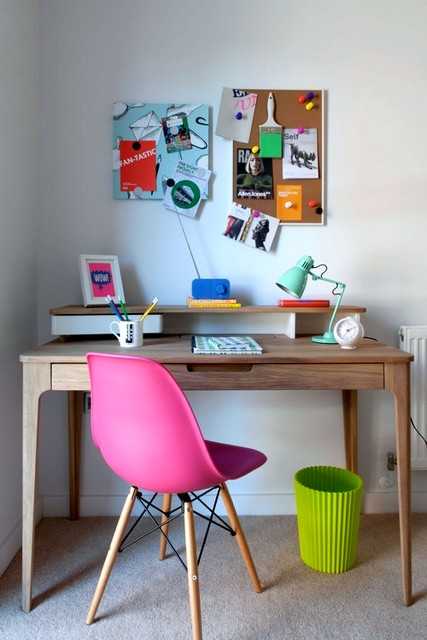 Если рабочий стол приставлен к стене, стоит подумать о её оформлении. Можно, конечно, ещё на стадии ремонта и отделки выделить этот участок (неважно, обоями ли, доской или чем-то еще). Это визуально обособит рабочую зону, вычленив её из общего пространства. Но даже в этом случае дополнительный декор не помешает.