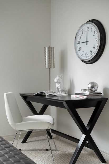Если места над столом много, можно применить смешанный декор, то есть украсить стену сразу несколькими предметами из перечисленных выше. Например, повесить над рабочим местом часы, доску для заметок и постер.