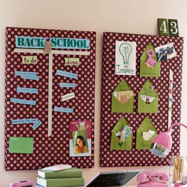 Для оформления женских кабинетов популярны французские доски для заметок. Они очень декоративны и изящны. Их особенность — это плотно натянутые ленты, пересекающие друг друга. Под них удобно подсовывать заметки, письма, напоминалки, фотографии, открытки и др. Можно использовать и прищепки. Вместо лент иногда задействуют тесьму, бечевку или шнурок.