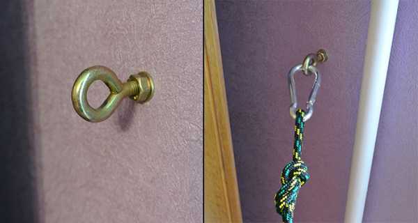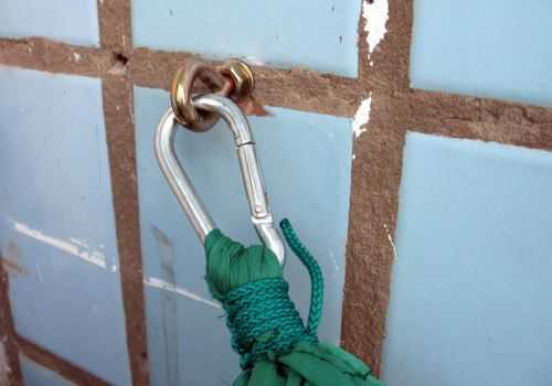 При отсутствии в большинстве квартир потолочных деревянных балок, к которым удобнее всего крепить гамак, его крепят прямо к стенам или к потолку. Если стены крепкие, повесить гамак проще простого. Нужны анкерные болты с кольцом и прочные карабины. В петли гамака лучше вставить металлические прокладки (коуши), чтобы петли не стирались об карабин.