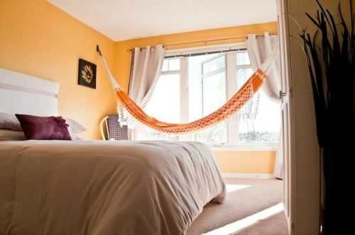 Если расстояние больше 3 метров или вам не хочется перегораживать гамаком всю комнату, можно повесить его на две смежные стены, поперёк угла.