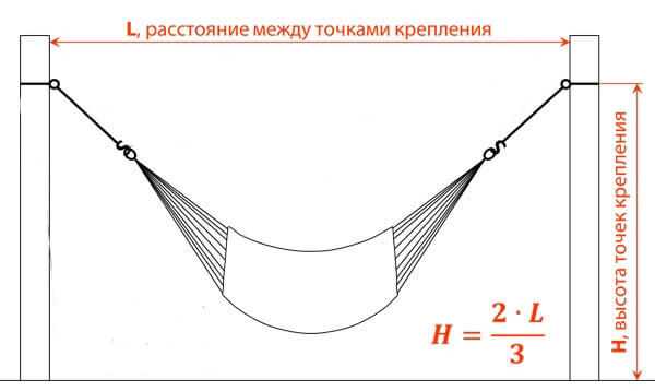 H = 2L/3, где Н – высота крепления, а L – расстояние между опорами. Например, если отрезок между деревьями равен 2,5 м, значит, крепления должны быть на высоте не ниже 1,66 м.