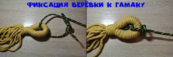 На концах верёвки сделать узел «простой проводник» (информацию о том как завязать этот и следующий рекомендуемый узел, читайте в отдельной статье: Узлы для крепления гамака). Далее, свободный край верёвки продеть в ушко петли гамака, и далее, в ушко образовавшегося узла (если края гамака оснащены карабинами, то мы просто крепим их за этот узел). Повторить тоже самое со 2-й верёвкой. Таким образом мы прикрепим верёвки к гамаку.
