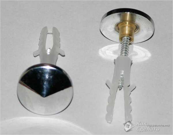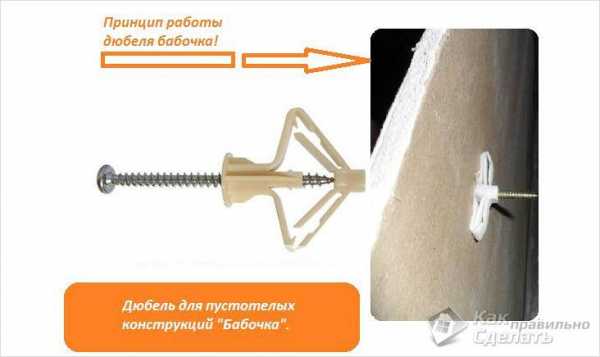 Если работы выполняется на поверхность оформленную гипсокартоном, то использовать нужно специальные дюбеля-бабочки. Они имеют продольные рёбра, которые не дают дюбелю проворачиваться, а стопорный болтик удерживает и не даёт креплению провалиться в стену.