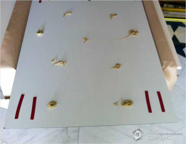 - Прижмите изделие к стене. Если используется клей, нужно будет установить опоры и подержать некоторое время.