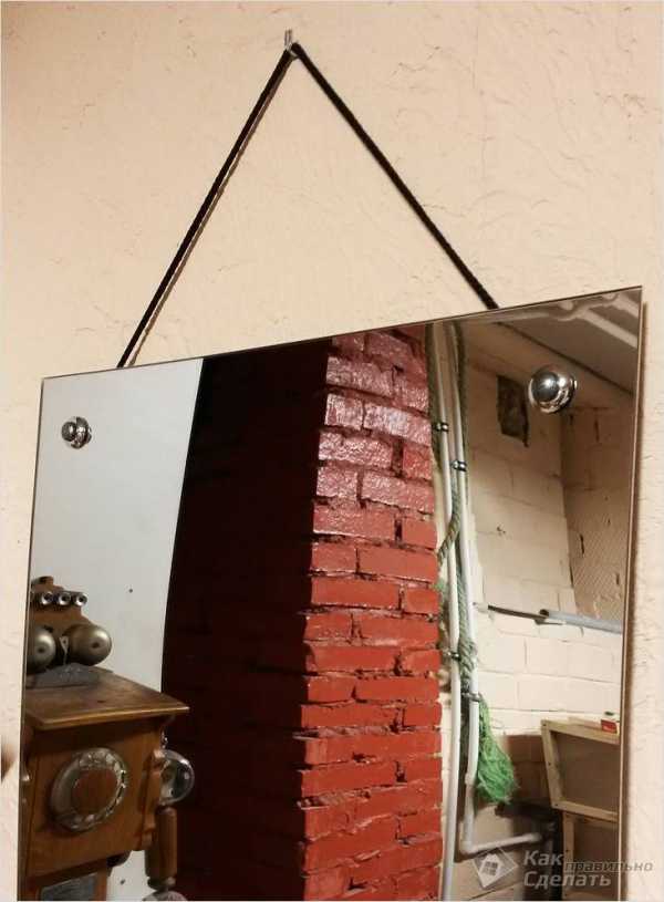 Монтаж своими руками не требует специальных навыков, все существующие способы можно выполнить самостоятельно. Самый обычный и привычный метод – на гвозди. Но они оставляют след в стене, в последующем, если зеркало уберёте, то отверстие нужно будет заделывать. Кто-то предпочитает картинный способ: с помощью специальной нити крепится к поверхности.