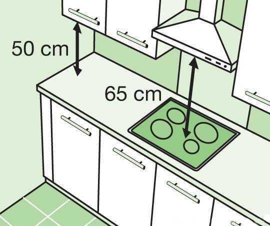 Вытяжка: над электроплитой устанавливается на высоте 65 см, а над газовой плитой высота 75 см. В противном случае хорошая циркуляция воздуха и быстрое исчезновение дыма невозможно.