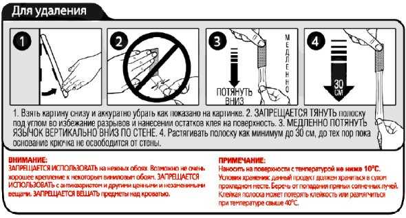 Прелесть этих липучек состоит в том, что их можно легко удалить без вреда для поверхности стен и использовать повторно, в отличии от двустороннего скотча. Существует несколько видов комплектации, которые различают в зависимости от допустимого веса. Самая минимальная комплектация – это 4 комплекта по 8 небольших полосок. Средняя включает в себя 3 комплекта по 6 полосок. В первом случае одна липучка выдерживает 100 г, а весь комплект – 450 г. Во втором случае липучка выдержит 400 г, а весь комплект – нагрузку до 1 кг. Чтобы демонтировать или перевесить картину нужно просто убрать белую полосу из системы.