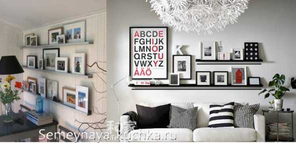 Если вам лень развешивать каждое фото отдельно, вот вам вариант с полочкой. Сделайте тонкую полку из доски и реек, закрепите ее на стене и установите туда фотографии.
