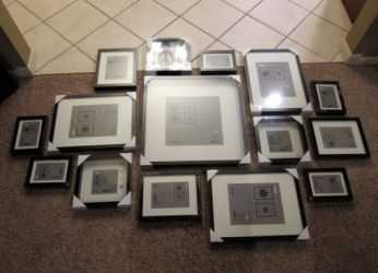 - Прежде чем вешать рамки на стену, нужно тщательно продумать, как их красиво расположить. Помните, что рамки не должны располагаться вплотную друг к другу, но и создавать между ними большие промежутки тоже не стоит. В данном случае выбран метод компоновки различных по размеру фоторамок вокруг одной, самой большой. Для того чтобы подобрать наиболее подходящее расположение фоторамок относительно друг друга, разложите их на полу. Сфотографируйте наиболее удачный вариант.