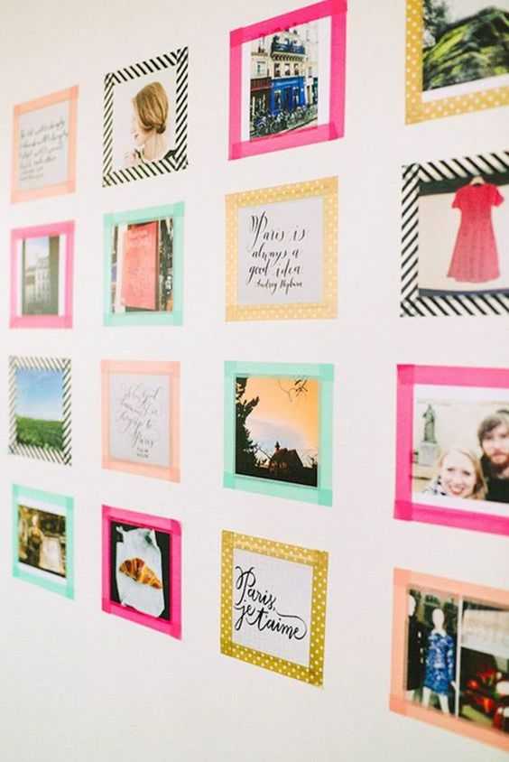 Если у вас скопилась масса фотографий и вы хотите сделать из них настенный коллаж, необязательно сверлить для этого стены. Используйте цветной скотч или тканевую клейкую ленту. Из них получатся полноценные рамочки. Фотографии можно предварительно заламинировать.