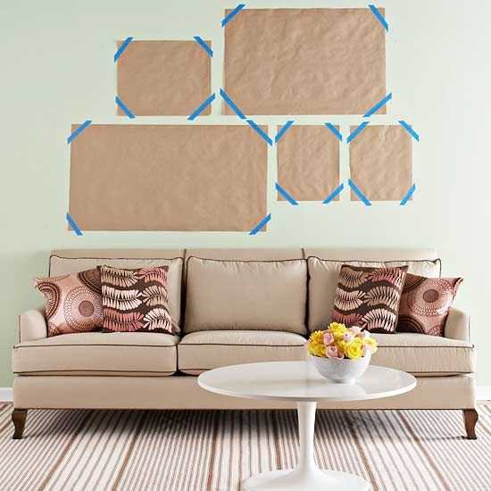 Если вы хотите повесить на одну стену сразу несколько разноразмерных картин или фото, то вам понадобится подготовка. Измерьте длину и ширину каждой картины и вырежьте из бумаги “муляжи”. Поэкспериментируйте с этими муляжами и изолентой, располагая их так или эдак на стене, пока не будете довольны результатом.