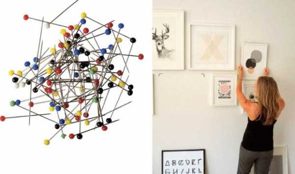 Швейные булавки – один из самых аккуратных способов крепления, который наносит наименьшие повреждения поверхности стен. Прислоните фото к стене и проколите его булавкой под небольшим углом к плоскости стены. Ее ножка должна пройти за обоями, но не воткнуться в стену. Вместо булавок можно использовать обычную швейную иголку. Она будет менее заметной. Такой крепеж способен выдержать вес до 500 граммов.