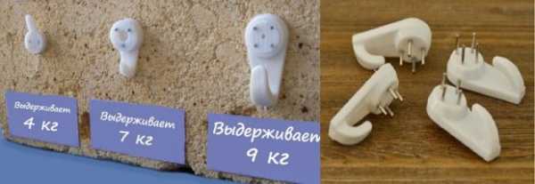 Такими простыми способами можно закрепить небольшие тарелочки из легких материалов, фотокарточки или маленькие картины в пластиковых рамках. Если выполнить несколько однотипных крепежей на одной линии, а на обратной стороне картины протянуть леску или капроновую нить в ушки по краям, то повесив ее таким образом на все крепления одновременно, можно значительно увеличить прочность крепления, а допустимый вес возрастет в несколько раз.