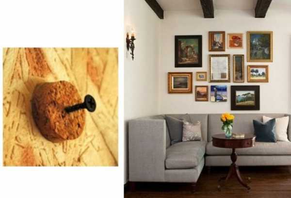 Для этого пробку от вина нарезают на небольшие кружочки, после чего приклеивают к стене с помощью быстросохнущего клея. Далее в эту пробку втискивается гвоздик, на который можно будет повесить фоторамку.