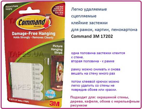 Чудо-липучки, или система «Command», отлично зарекомендовали себя в качестве способа крепления предметов на ровных, гладких стенах. Эти липучки выполнены из пластика. На концах они имеют небольшой крючок. Состоит эта система из двух частей, которые имеют липкий слой. Одна часть клеится на стену, другая на оборотную сторону желаемого предмета, а потом они соединяются между собой.