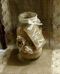 На горлышко стеклянной банки приклеиваем мешковину и кружево, сверху бусины или пуговицы.