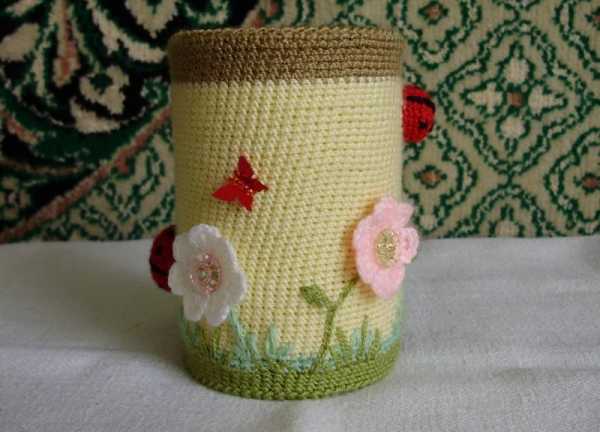 Доплетаем до верха банки, и заканчиваем работу в виде цепочки.