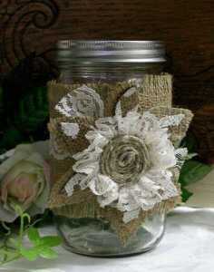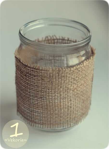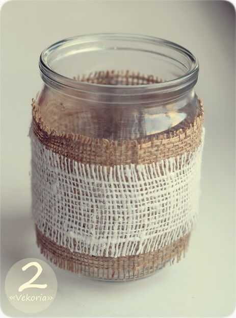 Одним из таких материалов является текстиль, в частности мешковина. С ее помощью можно создать потрясающие композиции на любых поверхностях, исключением не являются и банки из любого материала. Из мешковины можно шить декоративные чехлы, цветочки и клеить их на поверхность, просто обматывать емкость по периметру.