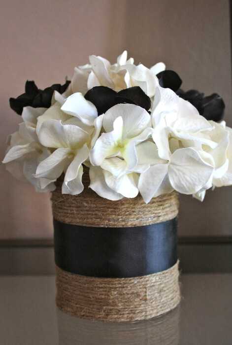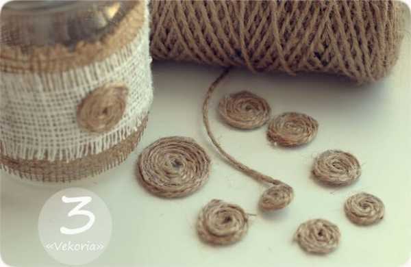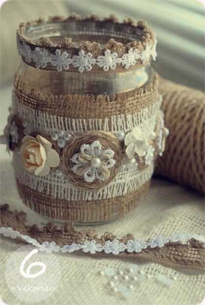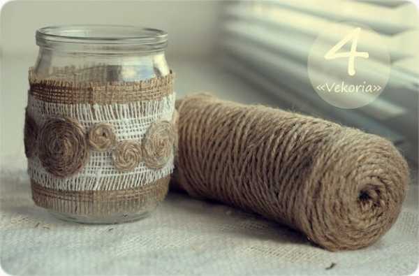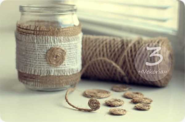 Бечевка подходит для создания различных узоров на поверхности банки, своеобразного чехла или рамки. Этот материал похож на лозу, и используется в тех же целях.