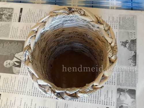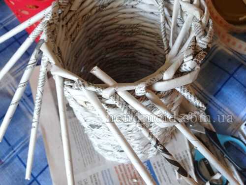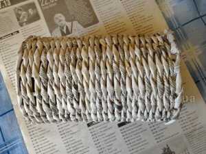 Давайте попробуем сплести небольшую вазу из стеклянной банки. Для начала очень простой мастер-класс. Трубочки скручиваются обычно при помощи спиц (берём газету, кладём спицу на уголок, и крутим, затем спицу вынимаем). Плетём «верёвочкой».