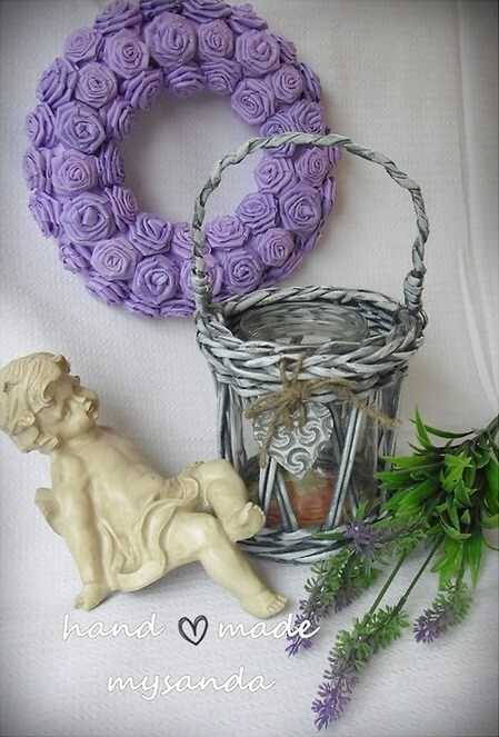 Ещё один декор стеклянной банки. Так же, как и в первом случае, можно оплести стеклянную банку под кашпо. То есть при помощи газетных трубочек, вот такой корзиной-кашпо можно украсить кухню или комнату.