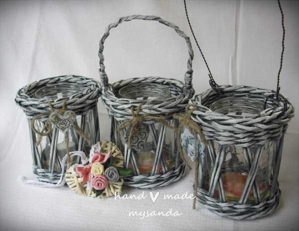 Еще одним интересным решением в сфере декорирования банок стала лоза. Кроме эстетического значения, она еще и защищает банки от механических воздействий. Благодаря технике плетения из лозы можно создать разнообразные композиции в виде чехлов и коконов, которые дополнительно можно украсить или раскрасить другими цветами, формируя интересный узор.