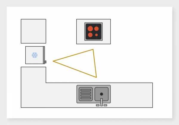 Хозяйка или хозяин в процессе готовки перемещаются по своеобразному треугольному маршруту: мокрая зона, горячая зона, зона хранения. Этот маршрут называют рабочим треугольником. Задача планировки — сделать перемещения по рабочему треугольнику максимально удобными и короткими.