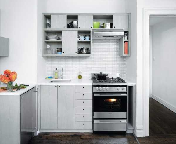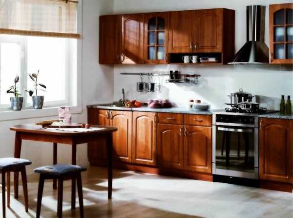 В маленькой кухне лучше всего отдать предпочтение узким полкам и шкафам в светлых тонах. Специалисты также рекомендуют полностью отказаться от мебели из натурального дерева темных цветов, так как это придаст кухне только мрачность.