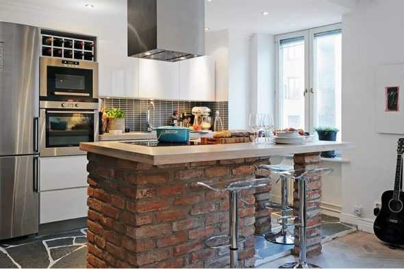 - Барная стойка. Вместо габаритного обеденного стола можно использовать компактную и стильную барную стойку. Она занимает меньше места и может служить отличным местом для быстрых перекусов или завтраков. А если соорудить двухрядную конструкцию, то о стандартном обеденном столе можно забыть.