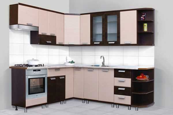 Угловое расположение гарнитура дает возможность разместить массу кухонной утвари