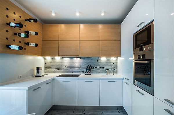 Когда кухня большая с двумя окнами и разделяется входной дверью или арочным перекрытием на две неравные части, то в меньшей из них также можно применить угловое расположение.