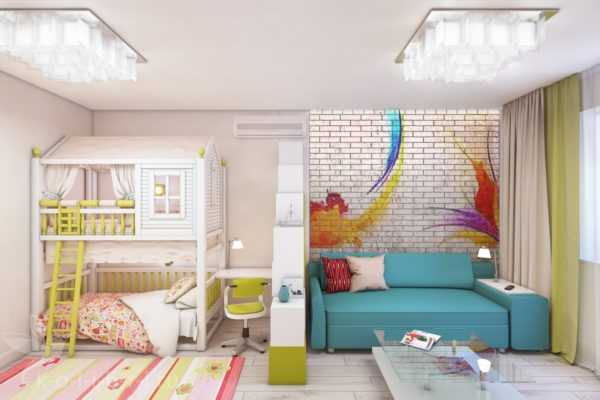 Гостиная и детская в одной комнате 18 кв м предполагает использование всего доступного пространства: фото в интернете показывают, что разделенные комнаты становятся маленькими и тесными. Ваша задача расширить их визуально. Это достигается за счет того, что на всем пространстве используется малогабаритная мебель, убирается большая часть аксессуаров и плохих предметов декора. Для отделения можно использовать перегородку из гипсокартона с нишами – это позволит сохранить пространство.