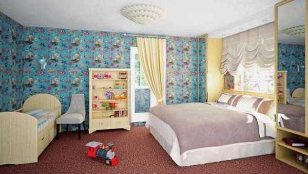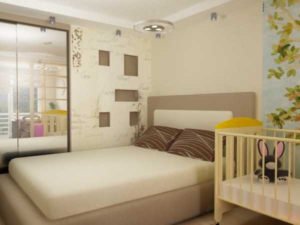 - рядом со своей кроватью. Есть родители, которые не хотят отдаляться от своего чада ни на минуту. Такое деление комнаты на спальню и детскую самое легкое, так как оно не требует принятия великих дизайнерских решений. Достаточно просто выделить детскую сторону другим цветом, ярким панно или обоями с веселым рисунком.