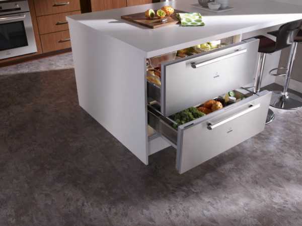 Интересно выглядит кухня с холодильником, когда морозильная камера находится отдельно от него. Оба устройства получаются небольших габаритов, и с легкостью вписываются в интерьер любого размера. Это решение привлекательно еще и тем, что образуется ровная поверхность, без резких переходов уровня.