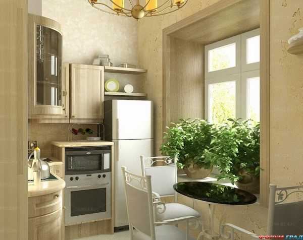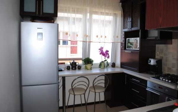 Малогабаритные кухни с холодильником требуют некоторой фантазии при дизайне. При дефиците места специалисты советуют размещать мойку, плиту и холодильный агрегат в один ряд. В таком случае, место холодильника часто оказывается у окна – в этом случае можно приобрести аппарат необычной расцветки или с зеркальной поверхностью.