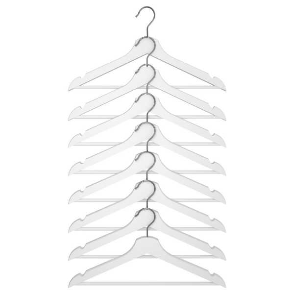 Для основного количества вещей закупите деревянные вешалки Ikea. У них хорошее качество, они не оставляют на одежде зацепок и пригодны для тяжелых предметов. Правда по ширине часто шире, чем нужно, и занимают немало места. Впрочем, для гардероба с верхней одеждой эти вешалки незаменимы.