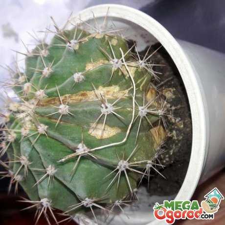 Гниль стебля от постоянного контакта с влажным грунтомВ новый горшочек на дно насыпается дренаж, затем немного смешанного в миске субстрата, а потом уже сажают растение, аккуратно расправляя корни и равномерно досыпая землю между ними. Утрамбовывать, сильно прижимать землю ненужно, можно лишь постучать по стенке горшка, чтобы земля засыпалась между корешков. Важно при пересадке кактуса, чтобы стебель (ствол, тело) не был засыпан землей, почва засыпается только до корневой шейки. Если стебель окажется в земле, то при поливе кактуса начнется его загнивание, что приведет к гибели растения, либо при контакте с влажной землей на стебле кактуса начинается опробковение — образование сухой коричневой корки. Схематично правильная пересадка показана на рисунке выше, где изображен горшок в разрезе (размеры и соотношения горшок-кактус практически в натуральную величину). Как правильно поливать кактусы мы уже упоминали, не забывайте, что частота полива зависит от температуры.