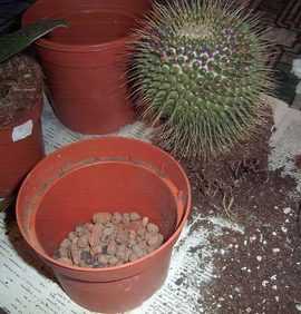 Пересаживать кактус надо в достаточно сухой, обязательно стерильный грунт. Горшочек для пересадки берите на 1 — 2 см. больше по диаметру чем предыдущий. На дно положите слой керамзита (около 1 см.) для улучшения оттока лишней воды при поливе. Но это при условии, что корневая система кактуса хорошо развита и заняла всю площадь предыдущего горшка. Иногда в процессе пересадки выясняется, что корни кактуса развиты плохо или мелкая корневая система является особенностью вида. В этом случае, горшок оставляем прежний и ограничиваемся сменой грунта, а иногда, даже меняем горшок на меньший в соответствии с размером корней кактуса. Ибо правильно подобранный горшок для кактуса должен быть больше корневой системы не более чем на 1 — 2 см. Это правило касается почти всех видов кактусов, при этом, например эхинопсис или цереус можно посадить, и в горшок большего размера, без ущерба для кактуса.