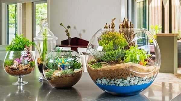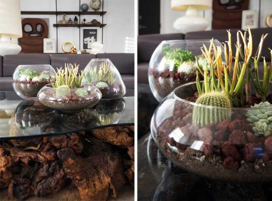 Кактусы – идеальны для домашнего разведения – они долго живут, красиво цветут и не требуют особого ухода. Их не нужно регулярно поливать, обрезать и опрыскивать. А своим шикарным цветением запросто разбавят интерьер дома или офиса. Чтобы создать декор из кактусов, применяют стеклянные мини-аквариумы, бокалы, террариумы и другие подобные емкости.