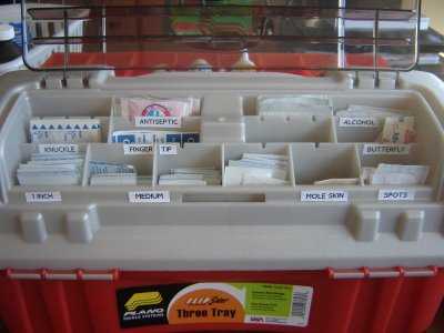 Упаковка аптечки должна быть герметичной, хорошо амортизировать удары, быть удобной в переноске. Оперативная аптечка должна содержать минимум средств и быстро извлекаться. В неё имеет смысл положить перевязочные материалы, нашатырь, перекись водорода, антисептик, зелёнку (строго для обработки поверхностей вокруг ран), жгут.