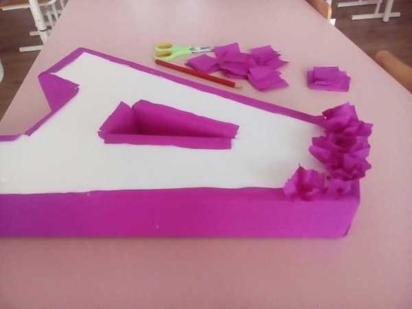 - Отступаем от края заготовки ширину полосы из креп-бумаги, приклеиваем на основу надрезанную гармошку бахромой наверх.